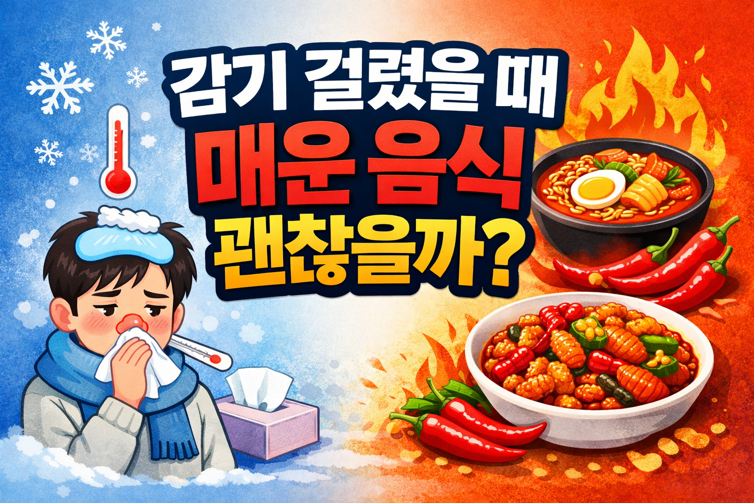 감기에 걸리면 유독 얼큰한 음식이 당기는 경우가 많습니다. 김치찌개, 짬뽕, 매운 라면처럼 땀이 쫙 나는 음식을 먹으면 뭔가 속이 뚫리는 느낌이 들기 때문입니다. 그렇다면 감기 걸렸을 때 매운 음식을 먹으면 실제로 도움이 될까요? 오늘은 감기와 매운 음식의 관계, 코막힘 완화 효과, 목통증 악화 가능성, 주의해야 할 상황까지 정리해 드리겠습니다.