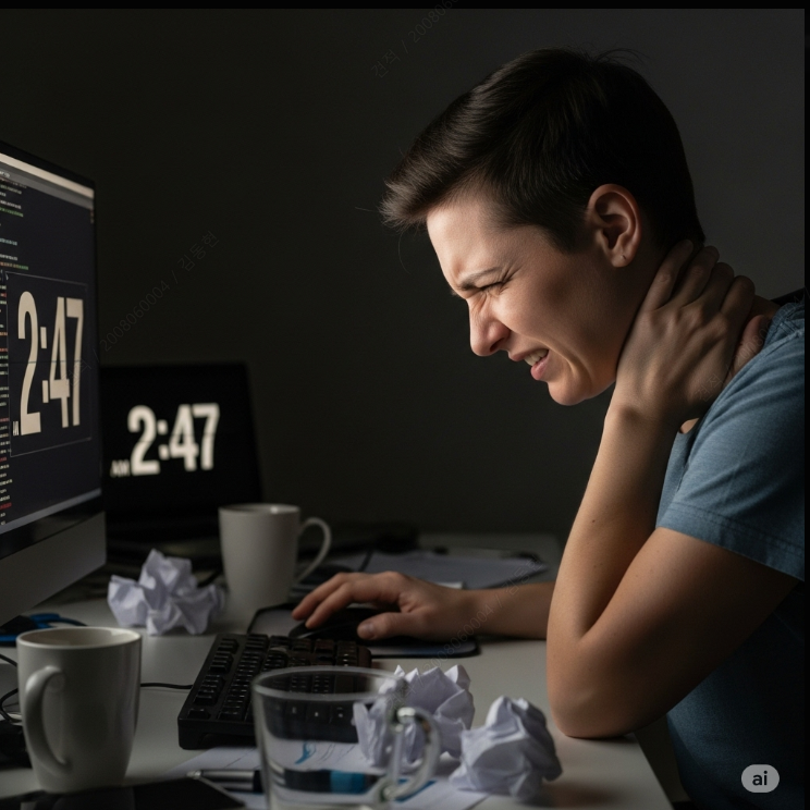 3. 스트레스와 긴장 정신적인 스트레스는 몸을 무의식적으로 긴장하게 만듭니다. 특히 목과 어깨 주변 근육(승모근 등)은 스트레스에 민감하게 반응하여 쉽게 뭉치고 뻣뻣해집니다. 중요한 일을 앞두고 있거나 긴장되는 상황에서 뒷목이 뻐근했던 경험을 떠올리시면 쉽게 이해할 수 있습니다.