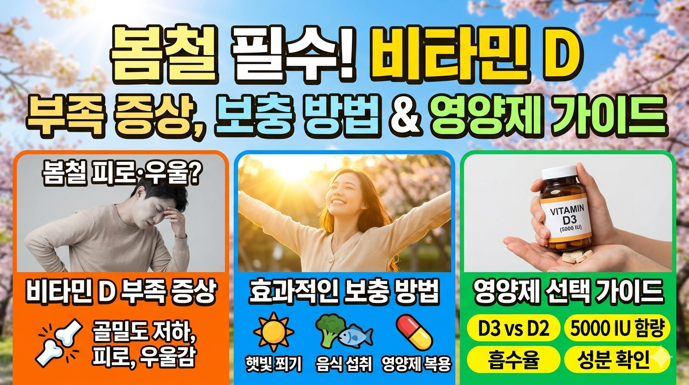 따라서 봄철에도 충분한 비타민 D를 보충하는 것이 중요합니다. 햇볕을 자주 쬐는 것이 이상적이지만, 생활환경이나 피부 상태에 따라 추가적인 보충이 필요할 수 있습니다.