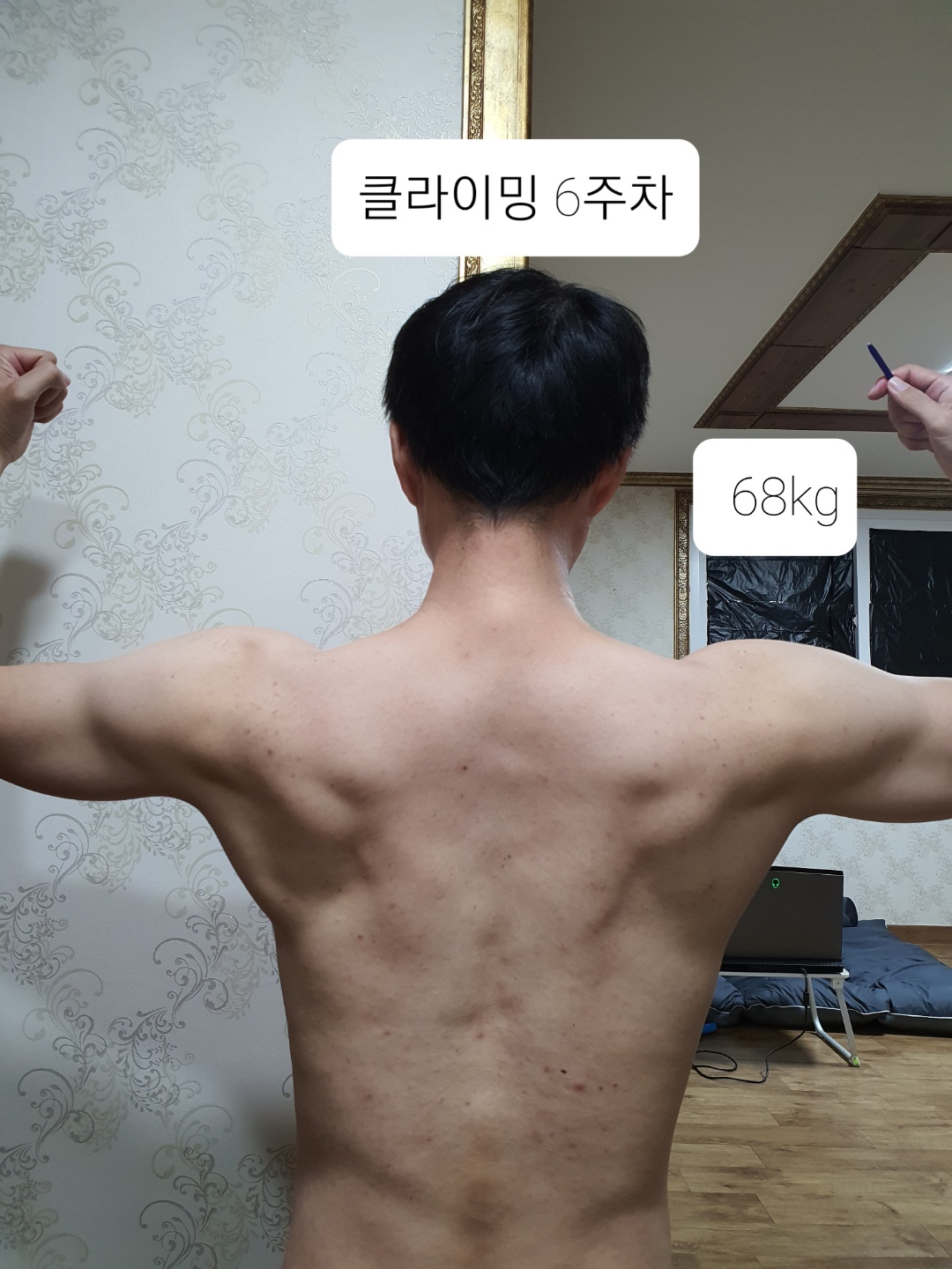 3주 전과 비교하면 체중이 줄었고 등이 좋아진 게 확실하게 보였습니다. 등이 많이 넓어진 것처럼 보이는데 각도 문제 같기도 해서 3주 후에 찍은 사진과 비교해봐야 할 것 같습니다.