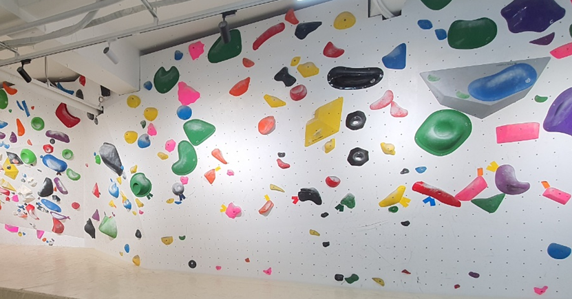 볼더링의 규칙에 대해 설명을 듣고 실제로 해보았습니다. 볼더링은 벽면에 띠의 색깔로 난이도를 구분하여 같은 색깔의 홀드만 사용하여 정상까지 등반하는 종목입니다. 클라이밍 종목 중에서 가장 접하기 쉽고 인기가 많은 종목입니다.